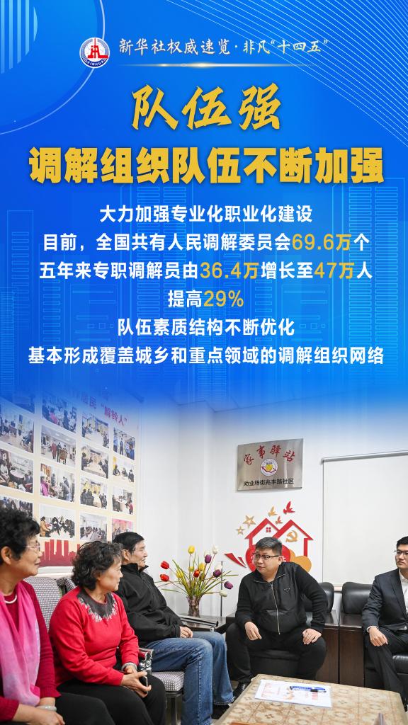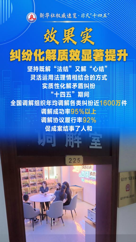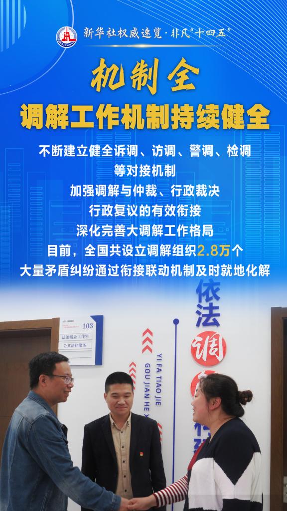 “十四五”期间,司法部坚持和发展新时代“枫桥经验”,充分发挥调解职能作用,以“机制全、领域广、队伍强、效果实”十二字为工作“秘诀”,大力加强矛盾纠纷排查化解,切实保障群众合法权益,维护社会和谐稳定。