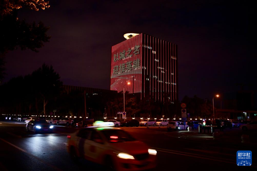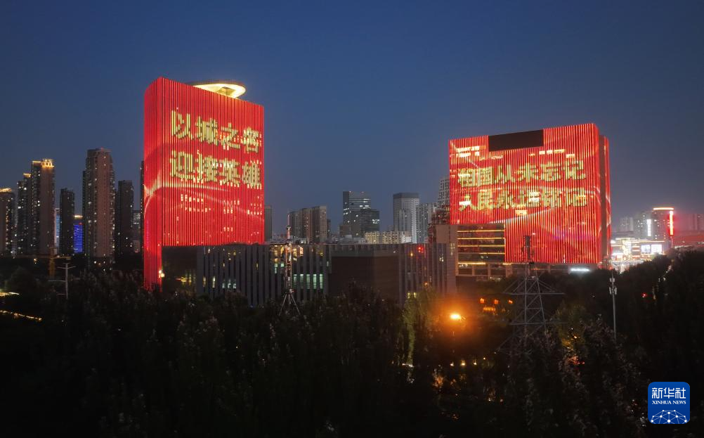 9月11日拍摄的沈阳青年大街上的建筑展示的标语(无人机照片)。