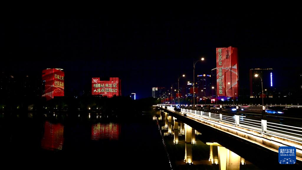 9月11日拍摄的沈阳浑河桥附近建筑展示的标语(无人机照片)。