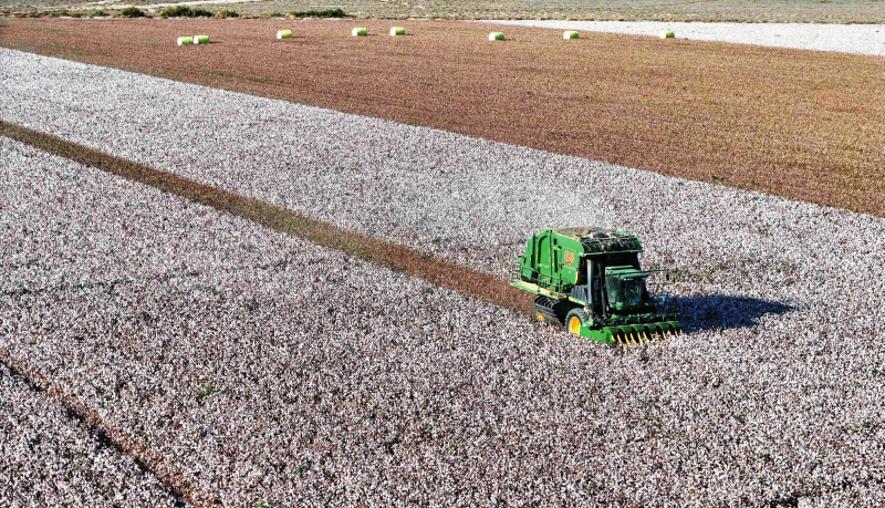 采棉机在新疆生产建设兵团第六师五家渠市105团的棉田采收棉花(2024年9月29日摄)胡虎虎摄/本刊