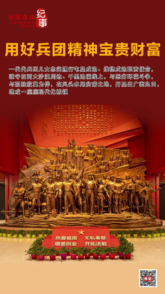 ◇2022年7月,习近平总书记在新疆考察时来到新疆生产建设兵团八师石河子市,参观新疆兵团军垦博物馆。会见兵团老中青三代建设者代表时,他强调,新疆生产建设兵团为推动新疆发展、增进民族团结、维护社会稳定、巩固国家边防作出了不可磨灭的贡献。兵团人铸就的热爱祖国、无私奉献、艰苦创业、开拓进取的兵团精神,是中国共产党人精神谱系的重要组成部分,要用好这些宝贵财富。
