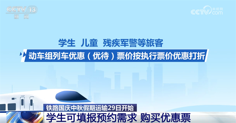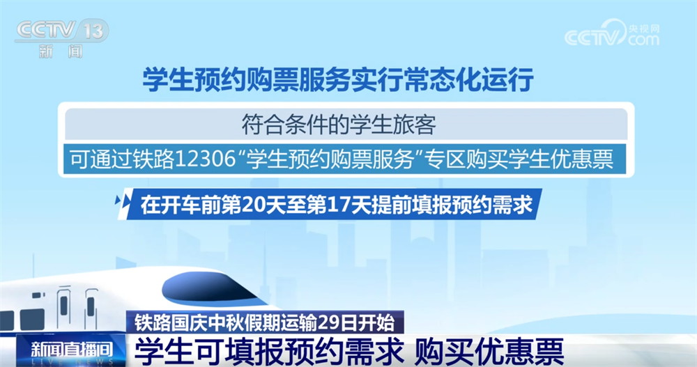 学生预约购票服务实行常态化运行,符合条件的学生旅客可通过铁路12306“学生预约购票服务”专区购买学生优惠票,在开车前第20天至第17天提前填报预约需求。学生、儿童、残疾军警等旅客动车组列车优惠(优待)票价按执行票价优惠打折。同时提醒旅客,国庆中秋假期车票紧张,尽量错峰出行,在直达车票售罄的情况下,可选择同车接续、中转换乘等方式购票出行。