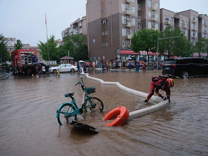 △9月16日,成都迎暴雨天气,消防员在成都天府新区采用应急排涝车、大功率水泵协同排水。