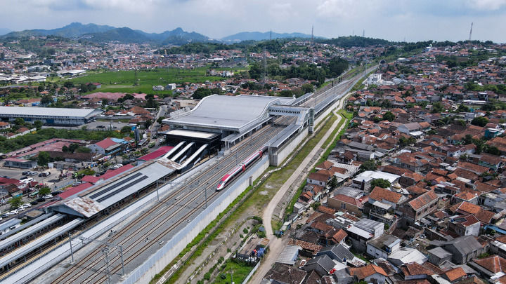这是2025年5月20日在印度尼西亚帕达拉朗拍摄的雅万高铁列车(无人机照片)。新华社记者 徐钦 摄