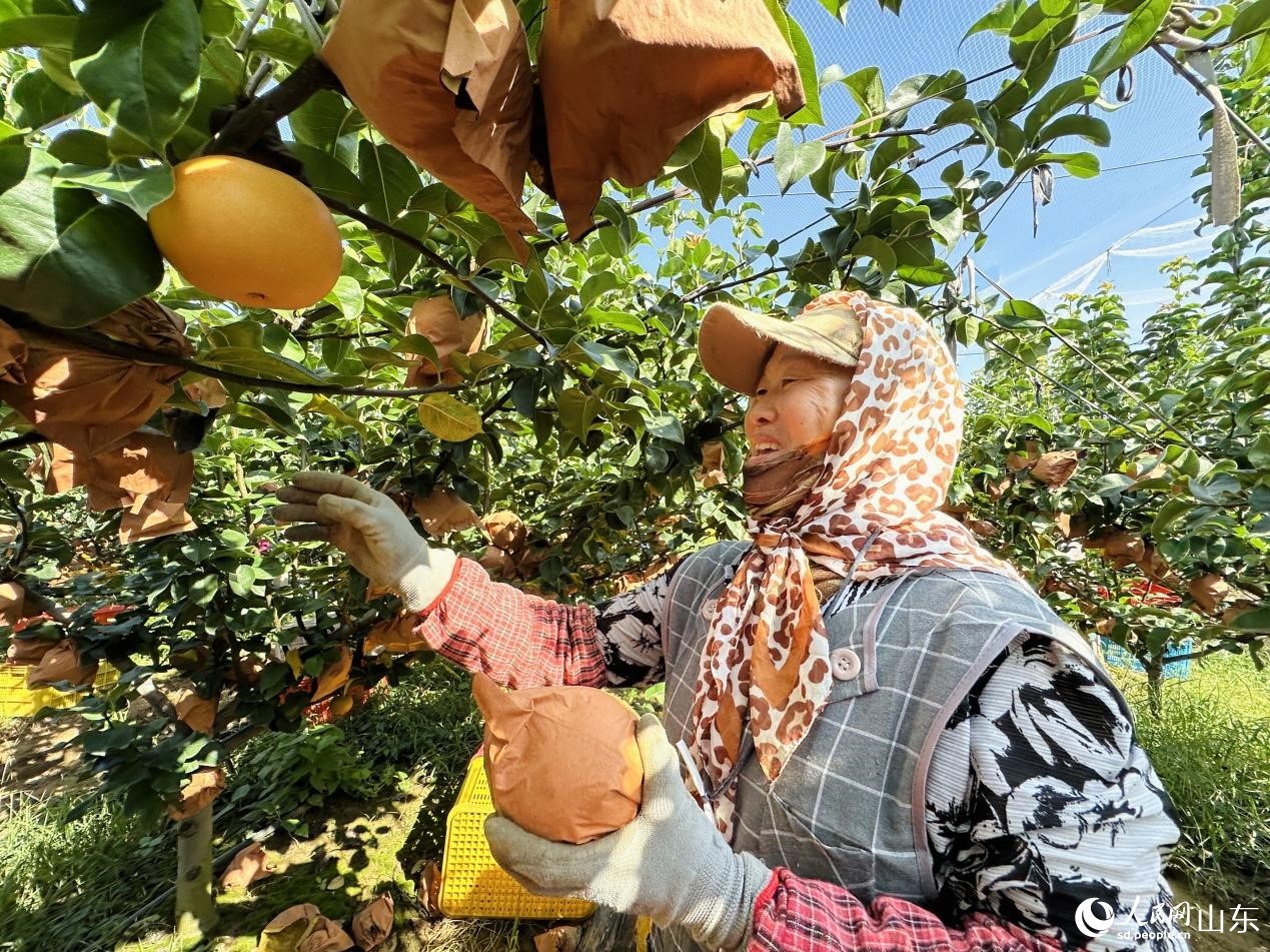 左彦玲正在采摘自家地里的秋月梨。人民网 乔姝摄