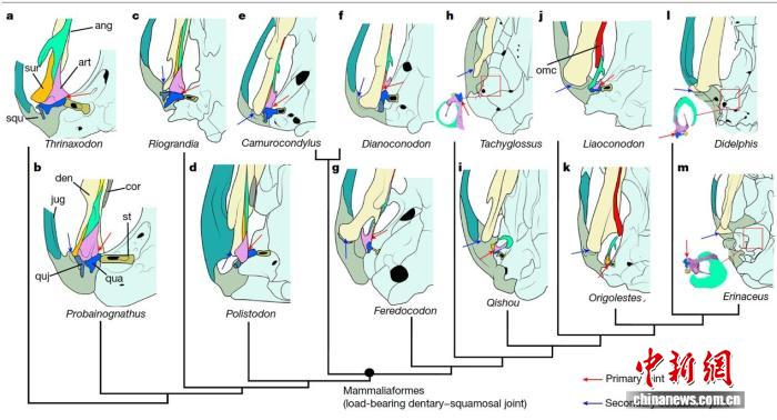 她指出,本项研究首次系统提出原始颌关节与次生关节演化的四阶段序列具体包括:一是爬行动物的关节骨-方骨原始颌关节;二是进步犬齿兽类的原始颌关节为主、次生接触点起辅助作用;三是哺乳形动物的次生颌关节成为主要承压结构,原始颌关节为辅并传导声音震动;四是哺乳型动物的完全齿骨-鳞骨颌关节,原始颌关节成为中耳听骨关节。