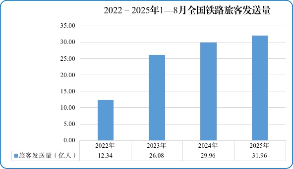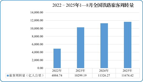2022-2025年1-8月全国铁路旅客周转量 图片来源:国家铁路局微信公众号