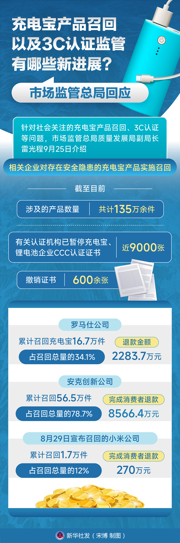 当日,在市场监管总局举行的质量安全监管专题新闻发布会上,市场监管总局有关司局负责人介绍了充电宝产品实施召回的新情况、加强充电宝CCC认证监管的新举措。