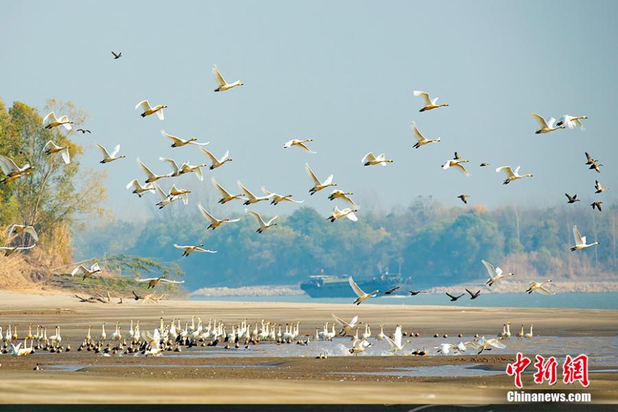 新济洲段长江沿岸,小天鹅伴随货物船只飞翔。园方供图