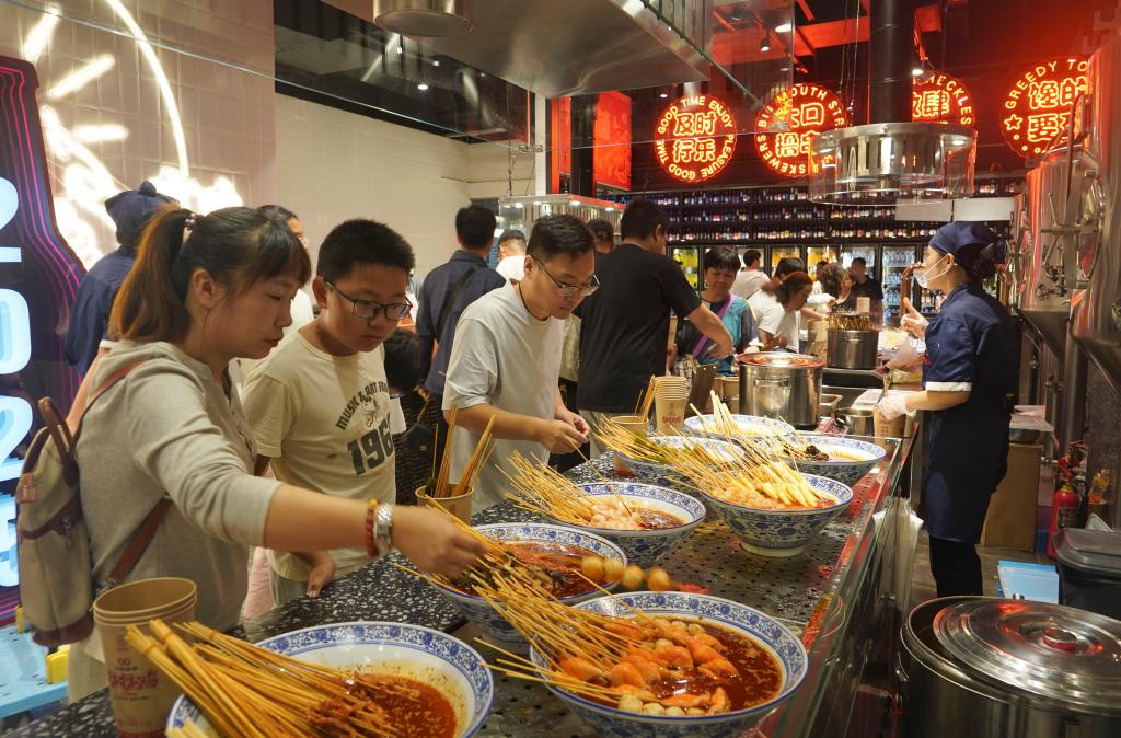 10月3日,游客在河北省唐山市唐山宴美食街品尝小吃。新华社发(梁志强 摄)