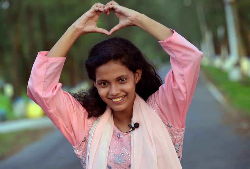 2023年5月26日,在孟加拉国首都达卡,阿里法·沁做出爱心手势表达对中国的爱意。新华社发