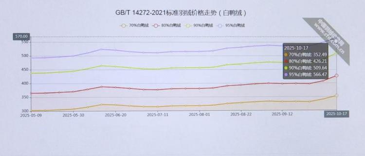 根据中国羽绒信息网的最新数据,90%绒子含量的白鸭绒原料约为每千克510元,折算下来每100克成本大约51元;而70%的白鸭绒每千克约352元,每100克成本约35元。