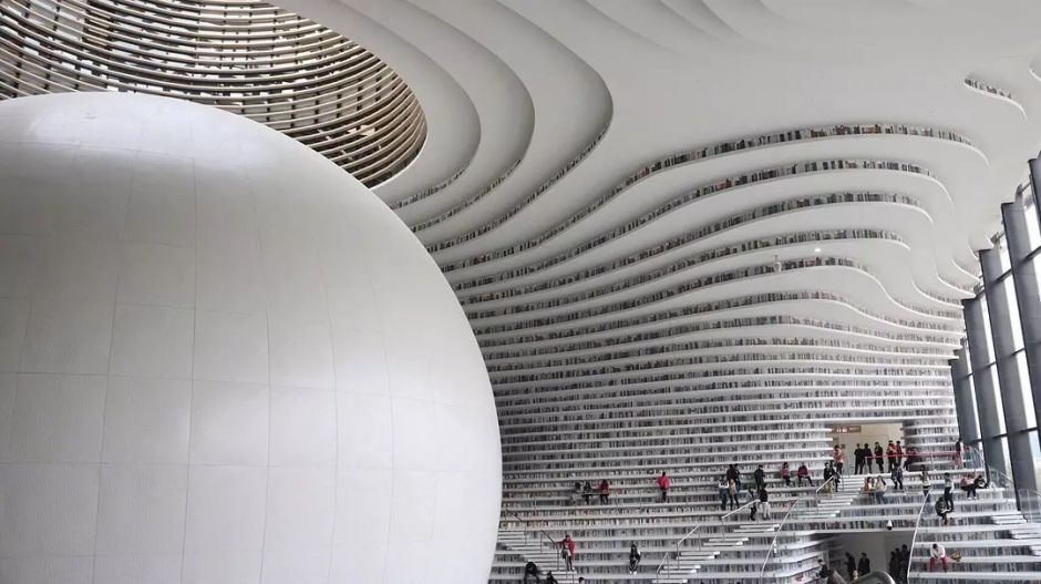 今年10月新开馆的天津滨海新区图书馆,开馆当天便成为了全国的“网红图书馆”。该馆由荷兰MVRDV与天津市城市规划设计研究院建筑分院合作设计,总建筑面积33700平方米。立意“滨海之眼”和“书山”。高颜值,依旧是不少人初识这座图书馆的关键词。滨海图书馆的中庭被设计成“书山”造型,一层层白色的阶梯呈波浪状铺开,阶梯之上架有同样波浪状的书架,读者可拾级而上,遇到一本喜欢的图书,便可坐在旁边的台阶上阅读。