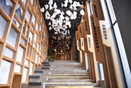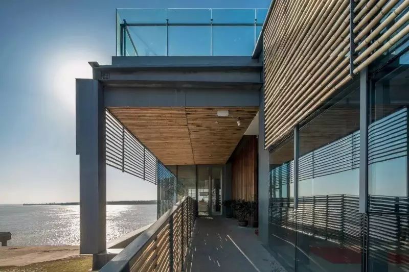 下层静思、中层阅读、上层观景,建筑如同从场地中长出一般协调自然,形成了一个通往书海的“码头”。一侧是满墙书籍,一侧是玻璃幕外江水悠悠,江风拂过,竹风铃发出悦耳的叮当声。此情此境中,翻一翻书,品一品茶,实在令人陶醉。