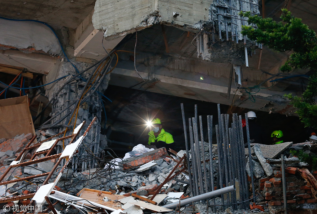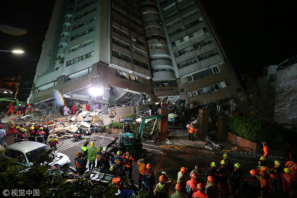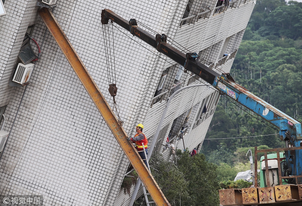2月7日,台湾花莲强震造成多栋大楼倾倒,云门翠堤大楼严重倾斜,搜救人员利用钢骨支撑大楼本体,持续进行搜救。