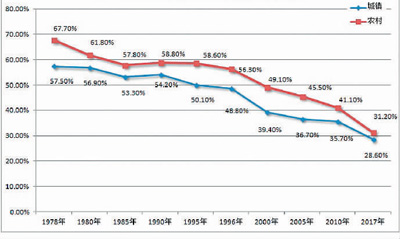 从数据看,改革开放40年来的恩格尔系数变迁,是中国经济发展水平大幅提升的一个直观反映。根据国家统计局相关数据,改革开放开始的1978年,中国城镇居民家庭人均生活消费支出为311元,恩格尔系数为57.5%,处于刚刚温饱状态;农村居民家庭人均生活消费支出为116元,恩格尔系数为67.7%,还处于贫困状态。经过25年实干、苦干,2003年全国居民恩格尔系数降为40%,属于小康级别。这个阶段,“吃”对很多家庭来说不再是问题,小汽车、房产开始成为消费大项。又经过10多年,2015年全国居民恩格尔系数进一步降为30.6%,属于相对富裕级别。到了2017年,全国居民恩格尔系数为29.39%(城镇28.6%、农村31.2%),进入了富裕区间,比改革开放初期总体下降了一半多。