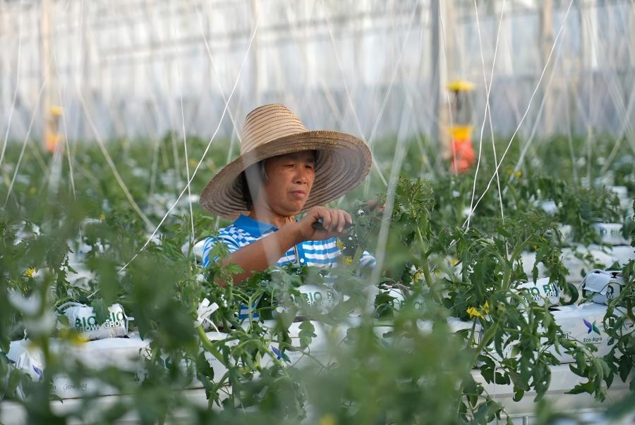 在江西省赣州市于都县梓山镇潭头村的果蔬种植基地,村民给丝瓜整枝(2025年1月3日摄)。新华社发(刘小强 摄)