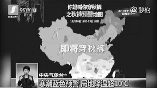 来感受一下,“一股强冷空气再次光顾我国,它速度快,降温猛、特别冷。影响南北很多省,江湖人称‘速冻小能手’。我们以日最低气温跌至5℃以下,作为穿秋裤的标准;日最低气温跌至10℃以下,作为即将穿秋裤的标准。虽然这个标准经常会随着你妈是不是认为你该穿秋裤而改变,那我们还是暂时以这个标准友情发布‘秋裤预警’”“……都已经被秋裤占领,尤其是……秋裤不足以御寒,棉裤已经登场。而江苏等地的小伙伴们可能会惊呼,我的秋裤在哪里?这波强冷空气用十足的诚意告诉你,劝君穿着秋裤走,寒潮来袭不会抖。”“寒潮来了,北方的小伙伴抱着暖气片,防寒靠搂;南方的小伙伴阴雨小雪冷飕飕,防寒抗冻基本靠抖。”“自打冷空气及时公布了自己的行程以来,多地的小伙伴都穿上了秋裤,以防被冻哭,但是我想告诉亲爱的观众朋友们的是,有的冷空气是一扫而过,非常快,有的冷空气却迟迟不愿离去……树木被吹得摇摇晃晃,出行的市民穿得鼓鼓囊囊,不捂好口鼻、穿好冬装,一定会被冻得眼泪汪汪。”