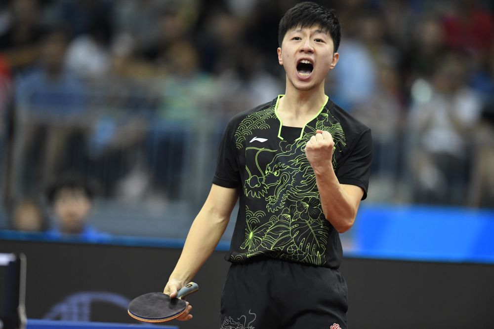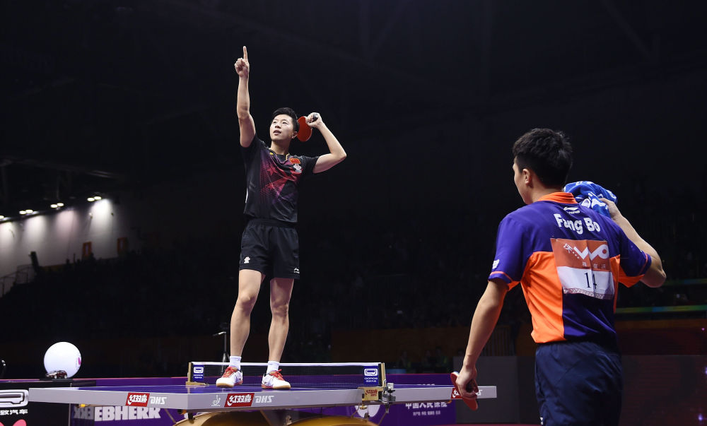 2017年6月5日,马龙在德国杜塞尔多夫举行的2017年世界乒乓球锦标赛男单决赛中庆祝夺冠。新华社记者 陶希夷 摄