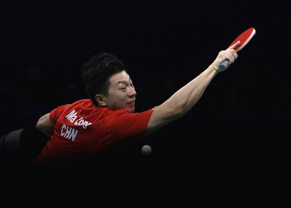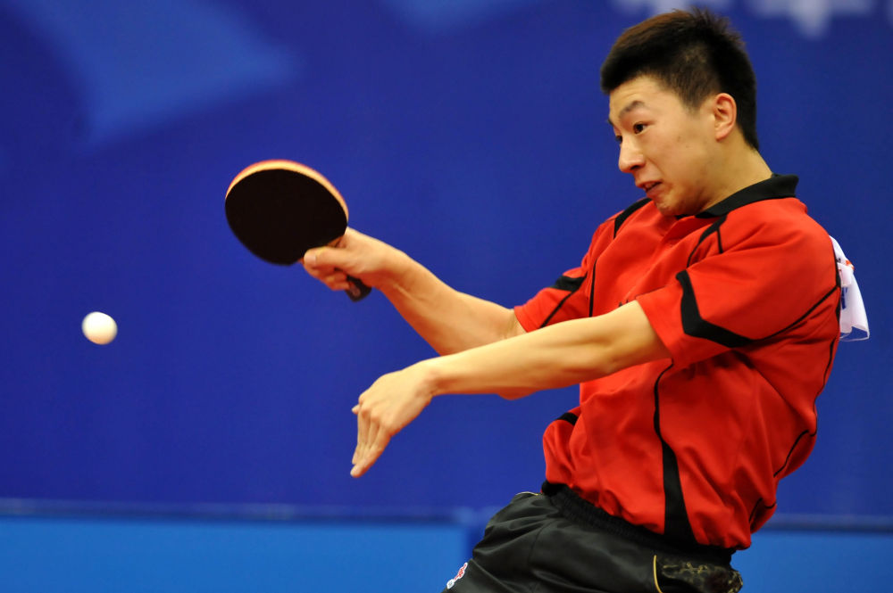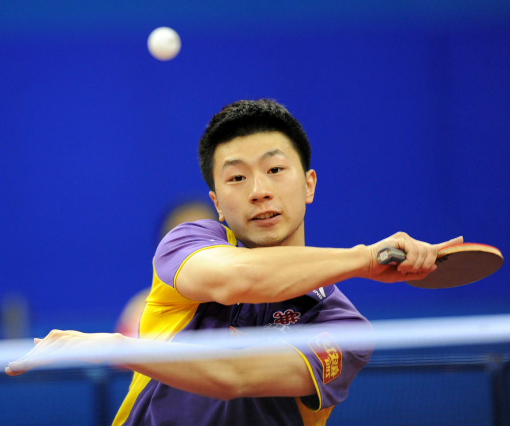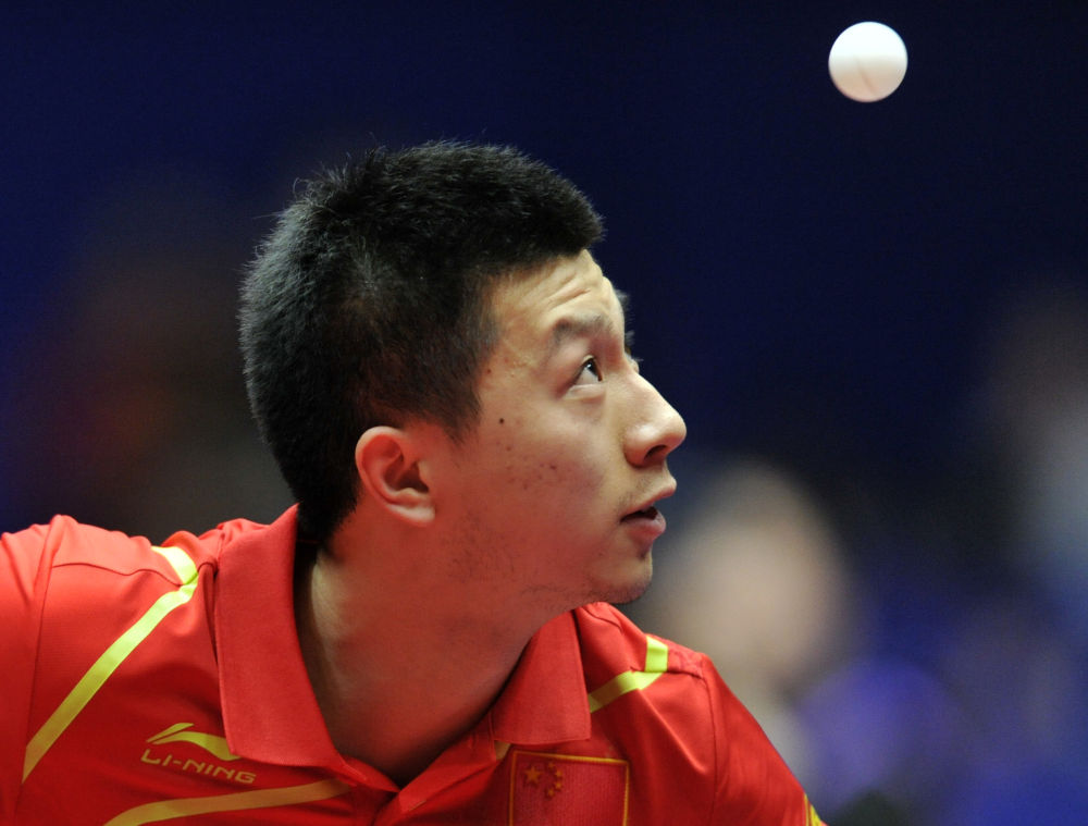 2012年4月1日,马龙在德国多特蒙德进行的第51届世界乒乓球团体锦标赛决赛中发球。最终,中国男队3比0战胜德国队,夺得冠军。新华社记者 马宁 摄