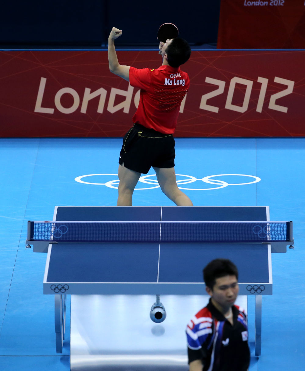 2012年8月8日,马龙(上)在伦敦奥运会乒乓球男子团体赛决赛中庆祝得分。最终,中国队3比0战胜韩国队,夺得冠军。新华社记者 殷刚 摄