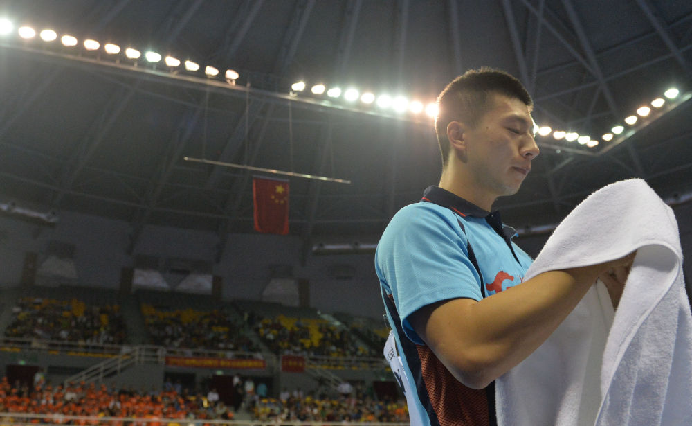 2013年9月4日,北京队选手马龙在第十二届全国运动会乒乓球男子团体半决赛中。北京队0比3不敌解放军队,无缘决赛。新华社记者 杨青 摄