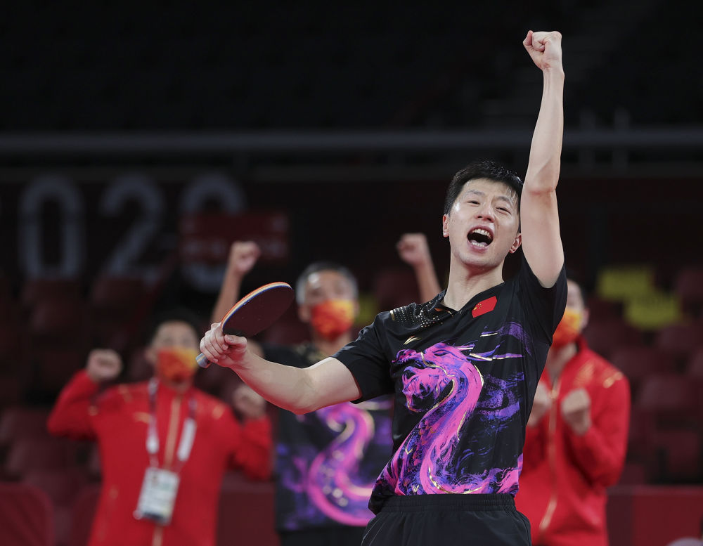 2021年8月6日,马龙在东京奥运会乒乓球男子团体决赛中庆祝。中国队3比0战胜德国队,夺得冠军。新华社记者 王东震 摄