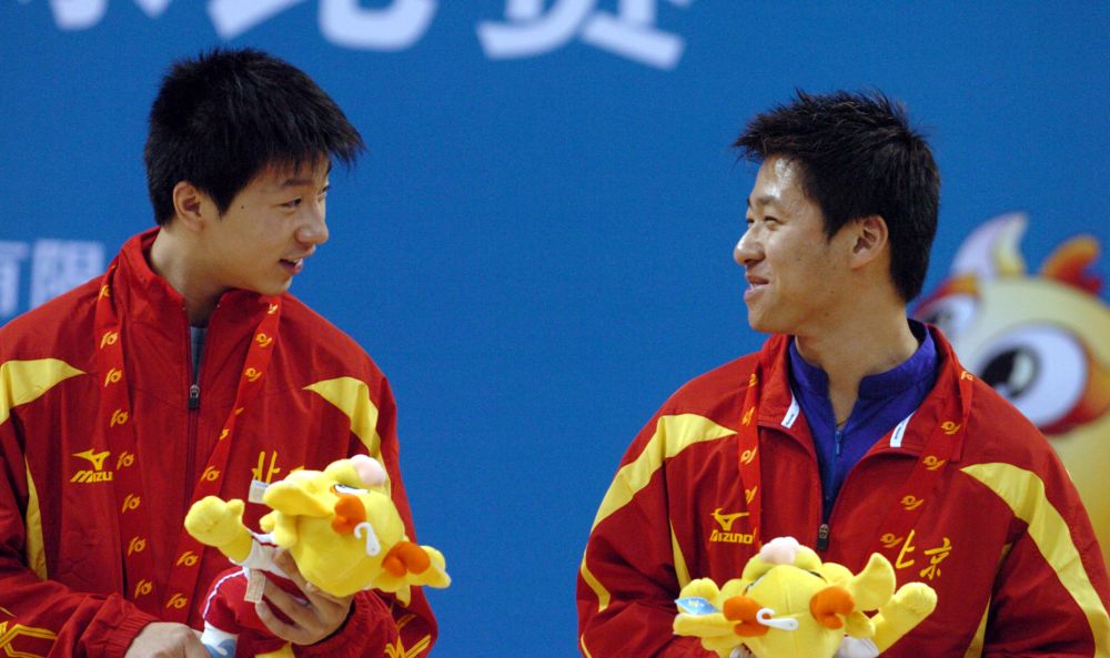 2005年10月17日,季军北京队组合马龙(左)/高伟在第十届全国运动会乒乓球男子双打颁奖仪式上。 新华社记者 杨俊江 摄