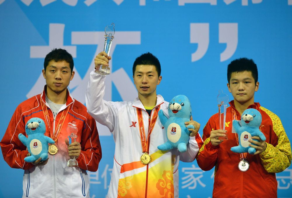 2013年9月10日,冠军北京队选手马龙(中)、亚军解放军队选手樊振东(右)和季军上海队选手许昕在第十二届全国运动会乒乓球男子单打颁奖仪式上。新华社记者 朱峥 摄