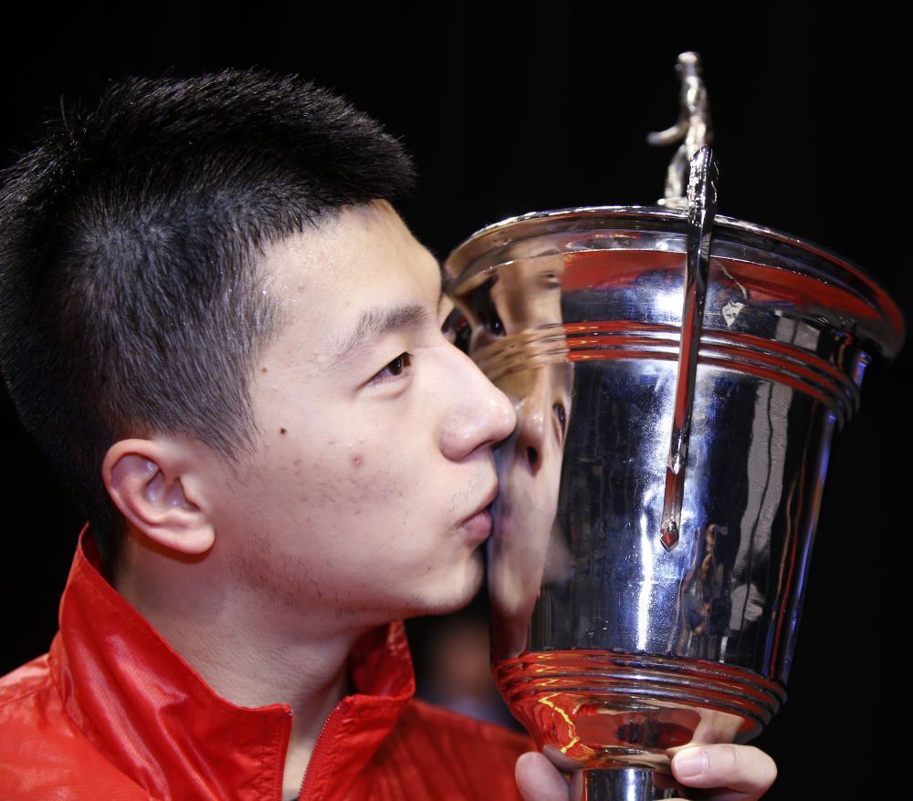 2012年9月30日,马龙在英国利物浦举行的2012男子乒乓球世界杯夺冠后亲吻奖杯。新华社记者 王丽莉 摄