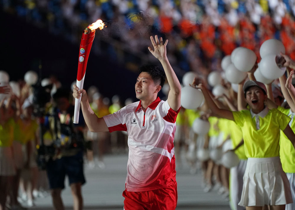 2021年9月15日,马龙在第十四届全国运动会开幕式上传递火炬。新华社记者 彭子洋 摄