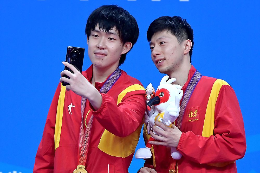 2021年9月25日,冠军北京队组合马龙(右)/王楚钦在第十四届全国运动会乒乓球男子双打颁奖仪式上。新华社记者 李安 摄