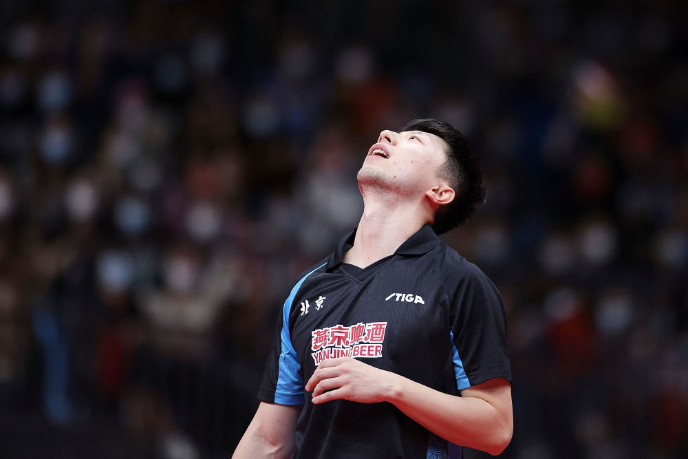 2021年9月21日,北京队选手马龙在第十四届全国运动会乒乓球男子团体决赛中。最终,北京队1比3负于广东队。新华社记者 张涛 摄