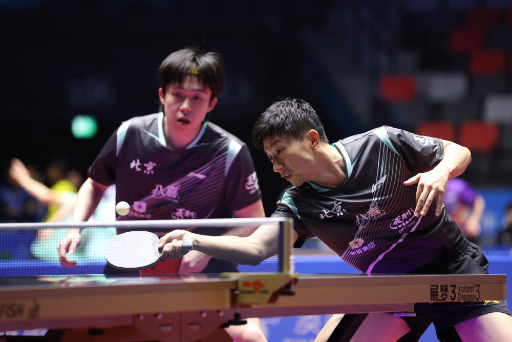 2025年11月18日,北京队组合马龙(前)/王楚钦在第十五届全国运动会乒乓球男子团体四分之一决赛中。新华社记者 梁旭 摄