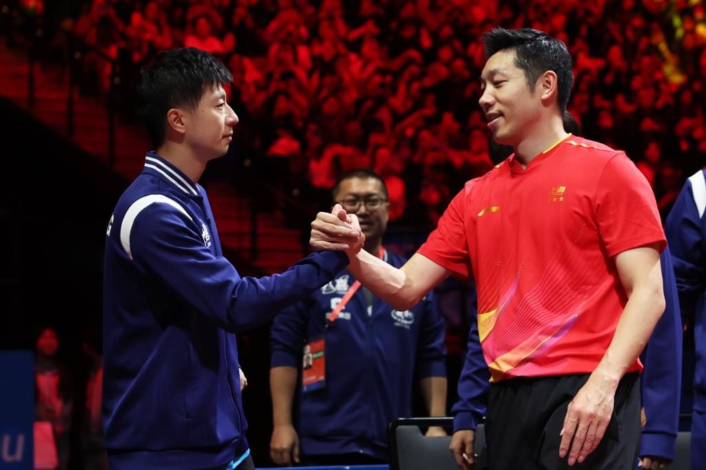 最后一球落地,王楚钦与许昕握手致意,许昕走向北京队,与多年的搭档马龙拥抱。