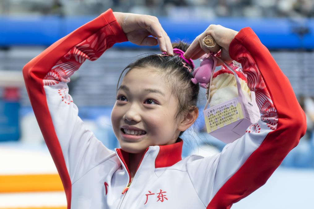 11月17日,广东队选手柯沁沁夺得体操项目女子平衡木冠军。新华社记者杜子璇摄