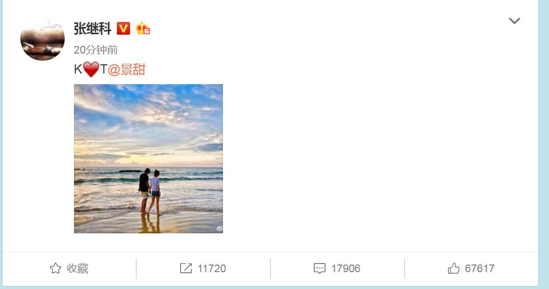 张继科在微博中写出“KT”的二人名字缩写,并用爱心将其连接,图片中显示,二人手牵手在海中漫步,此消息一出便受到网友极大关注,网友纷纷对他们表示祝福:“希望好好的,祝你们幸福哈”。