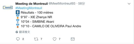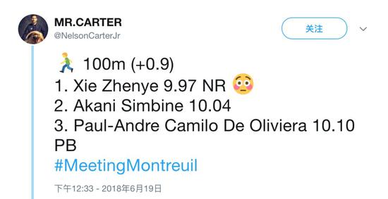 北京时间6月20日凌晨,在法国蒙特勒伊举行的田径赛上,中国飞人谢震业在男子100米大战中,身居第一道,最终第一个撞线,成绩是9.97秒!